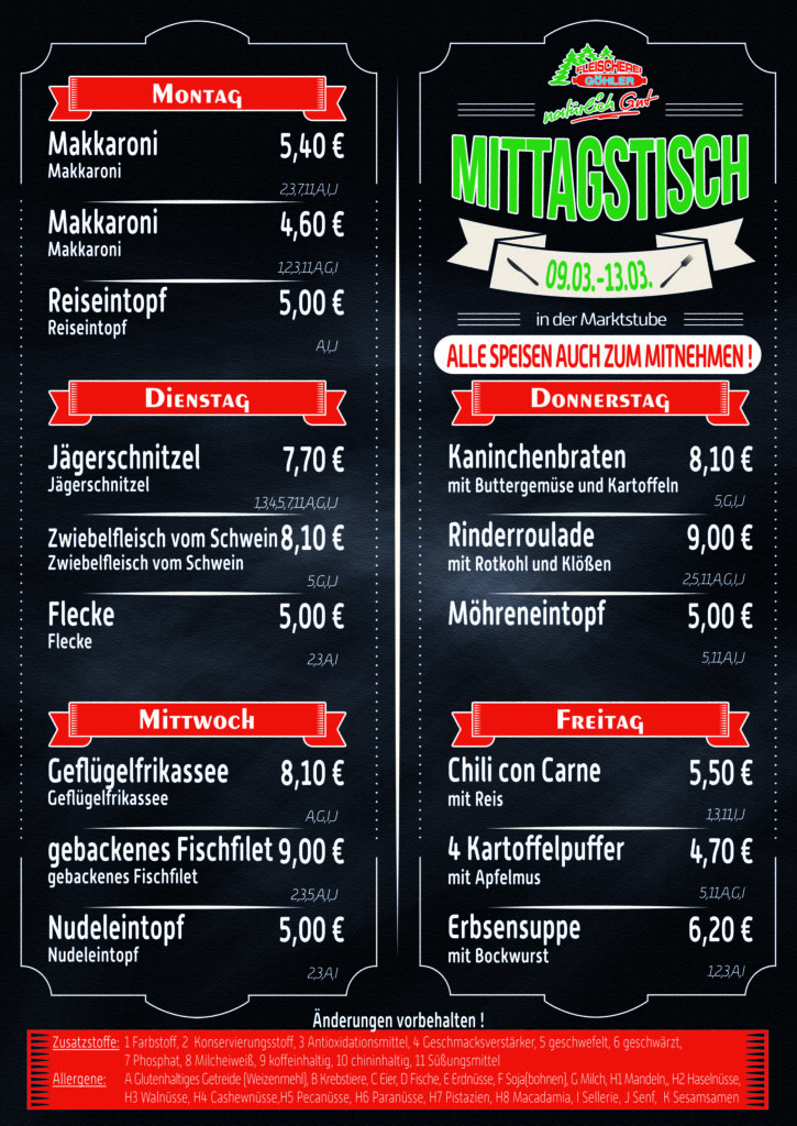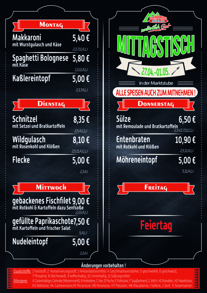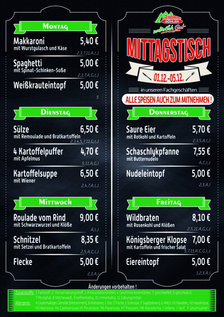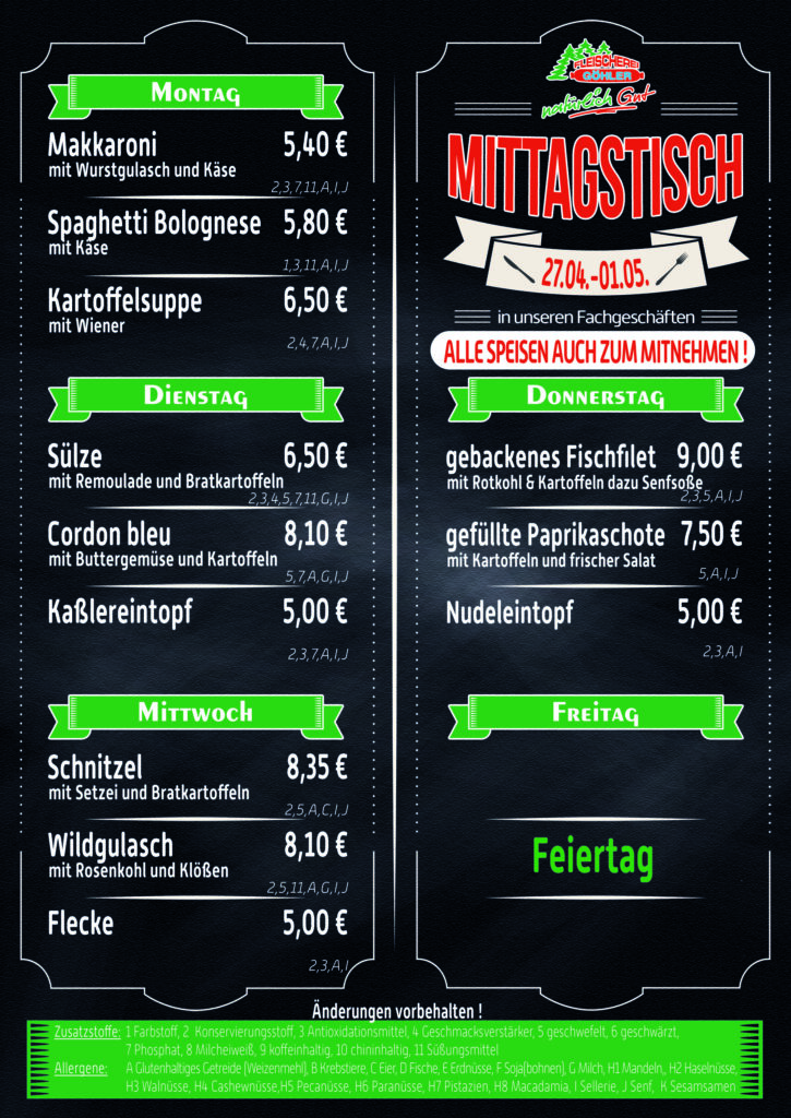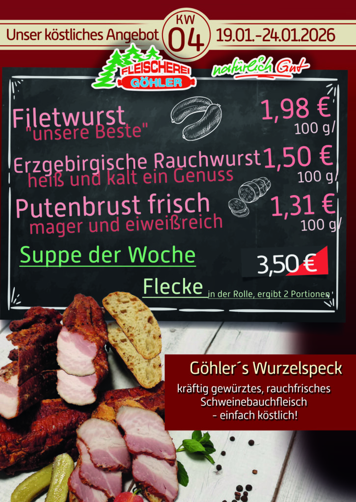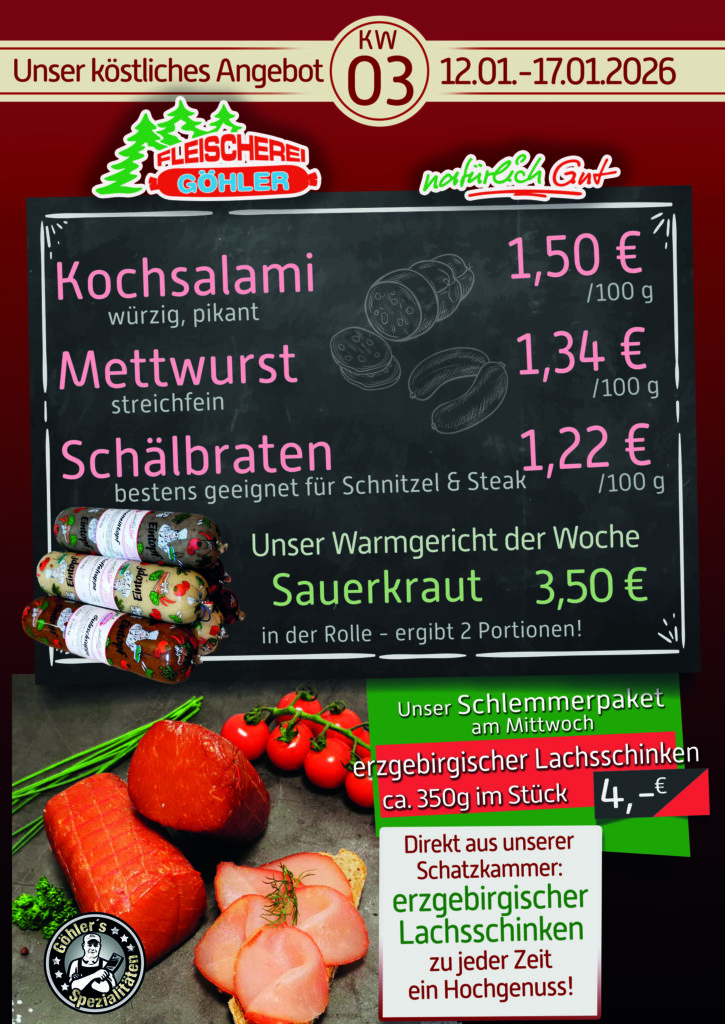 Neben unseren hauseigenen Fleisch- und Wurstwaren, erwartet Sie bei uns ein vielfältiges, jeden Tag wechselndes Mittagsmenü. Die Speisen werden in unserer Hauptfiliale in Zschopau frisch zubereitet. Ob herzhafter Eintopf, leichte Gerichte oder klassische Hausmannskost …an jedem Wochentag gibt es 3 Hauptspeisen nach Plan zur Auswahl.