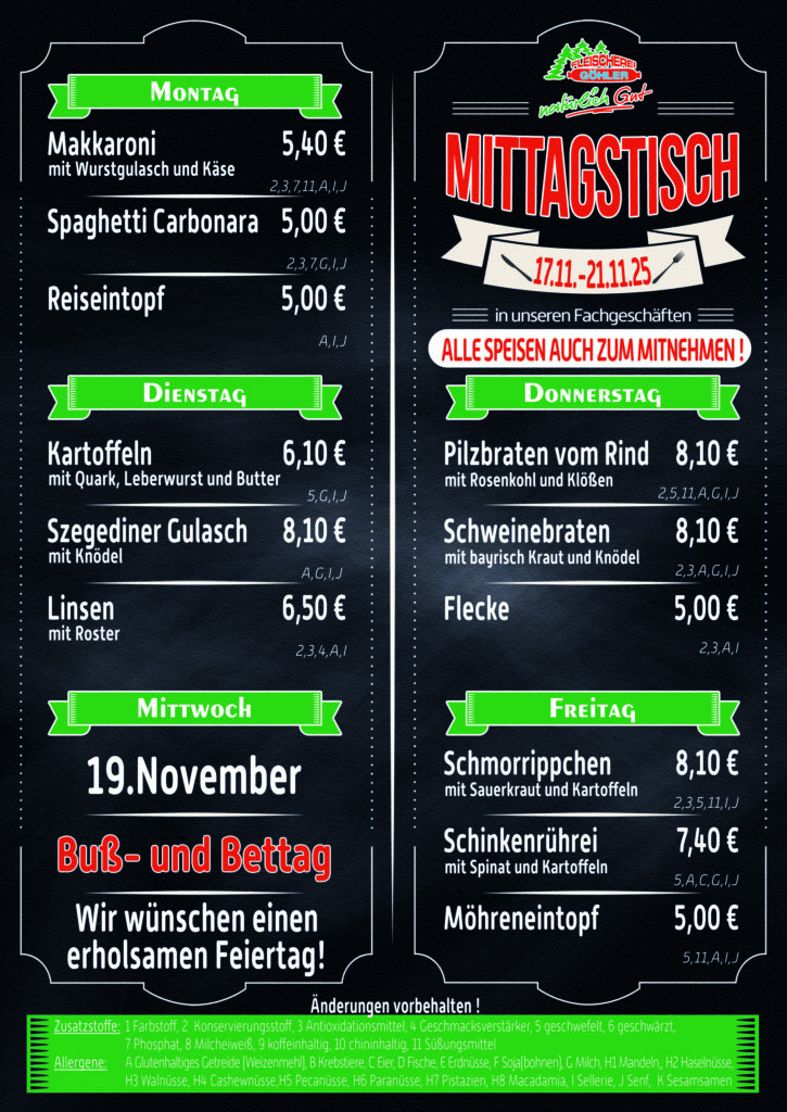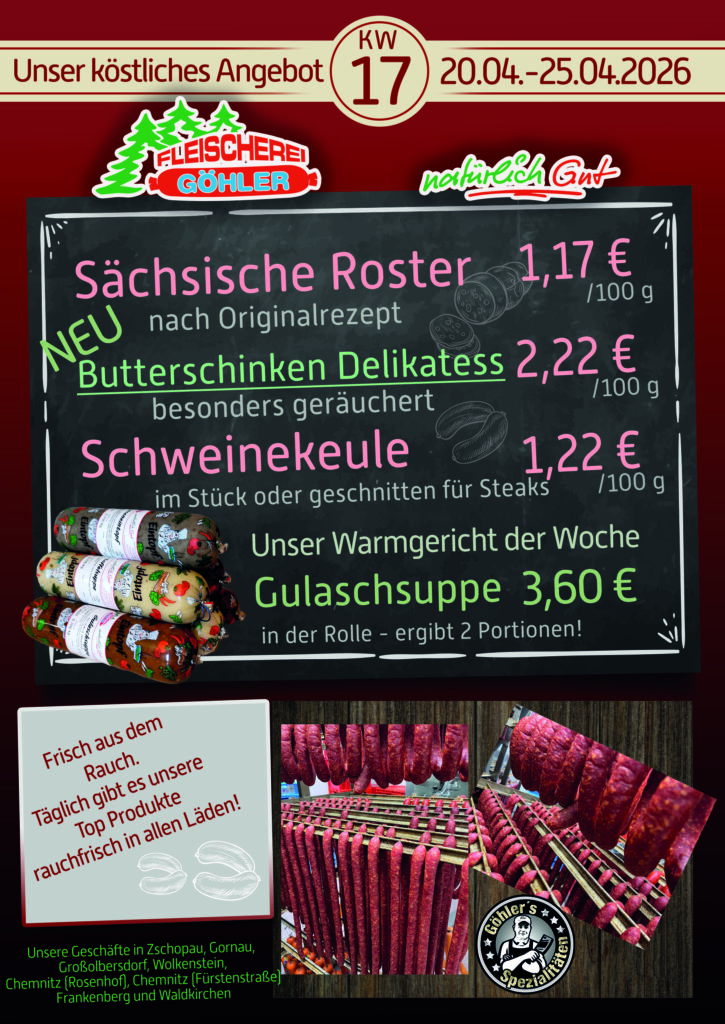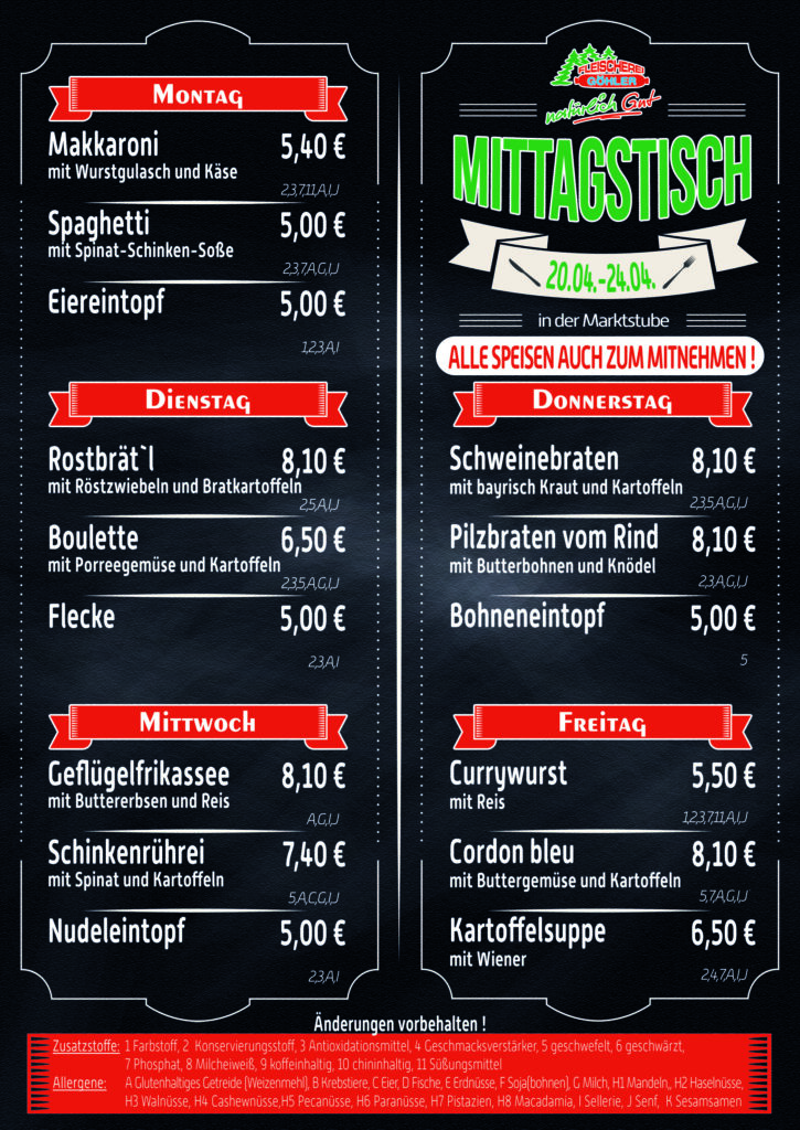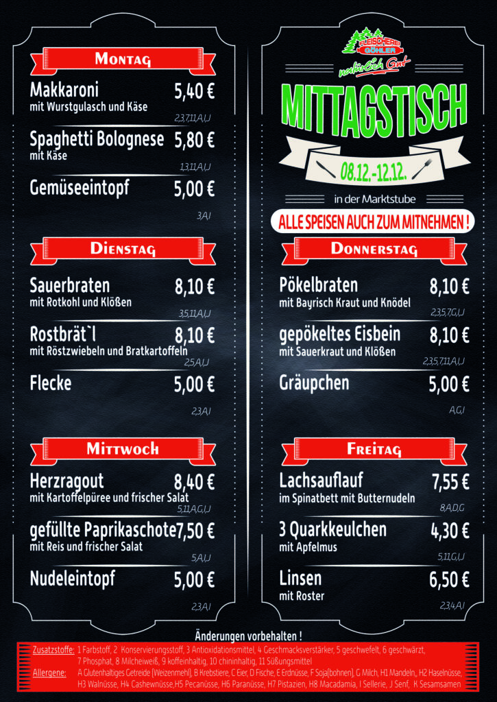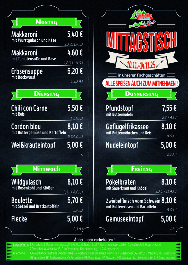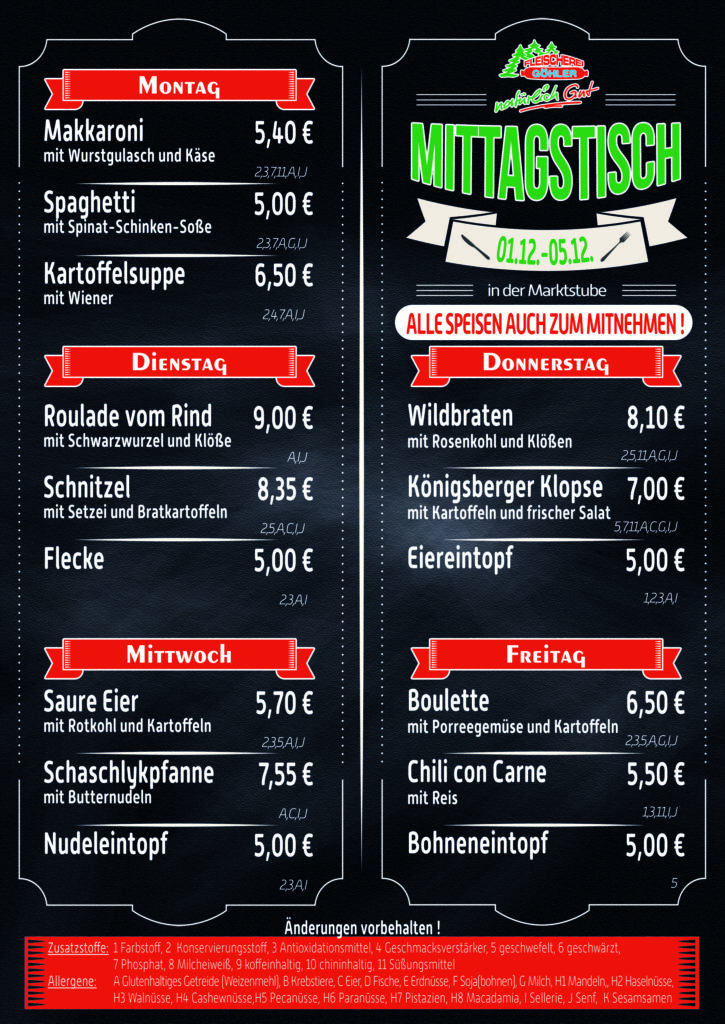 Neben unseren hauseigenen Fleisch- und Wurstwaren, erwartet Sie bei uns ein vielfältiges, jeden Tag wechselndes Mittagsmenü. Die Speisen werden in unserer Hauptfiliale in Zschopau frisch zubereitet. Ob herzhafter Eintopf, leichte Gerichte oder klassische Hausmannskost …an jedem Wochentag gibt es 3 Hauptspeisen nach Plan zur Auswahl.