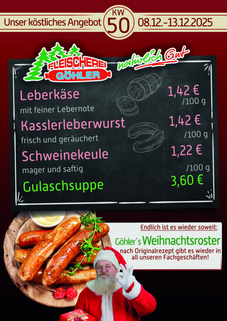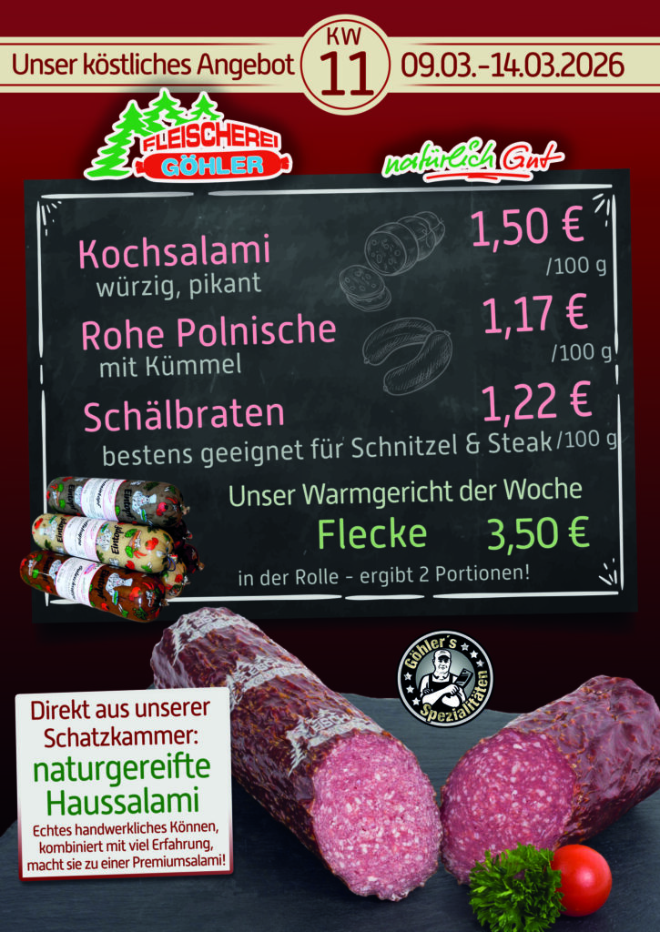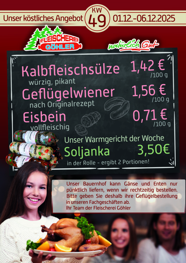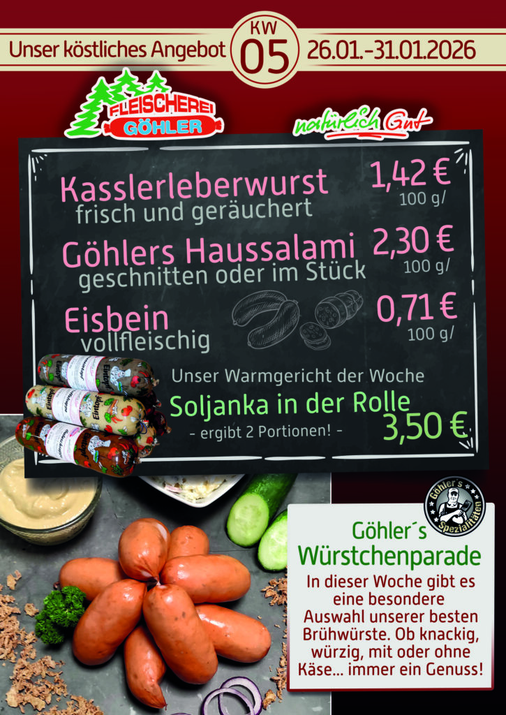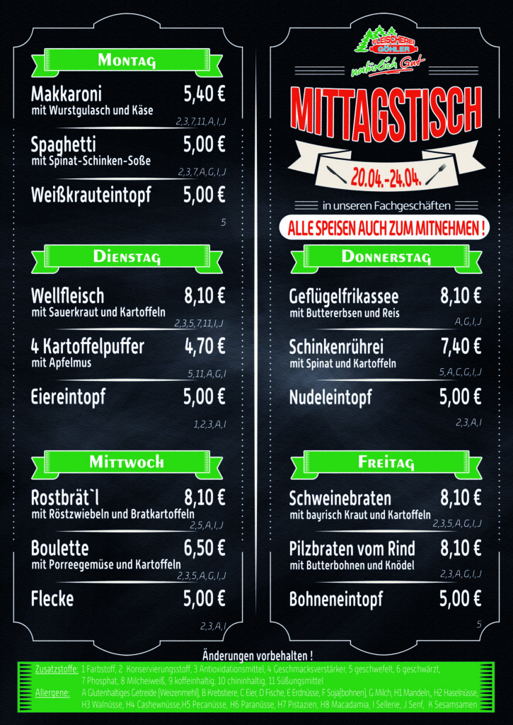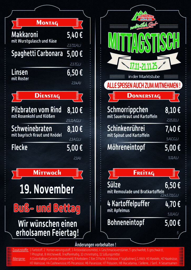 Neben unseren hauseigenen Fleisch- und Wurstwaren, erwartet Sie bei uns ein vielfältiges, jeden Tag wechselndes Mittagsmenü. Die Speisen werden in unserer Hauptfiliale in Zschopau frisch zubereitet. Ob herzhafter Eintopf, leichte Gerichte oder klassische Hausmannskost …an jedem Wochentag gibt es 3 Hauptspeisen nach Plan zur Auswahl.